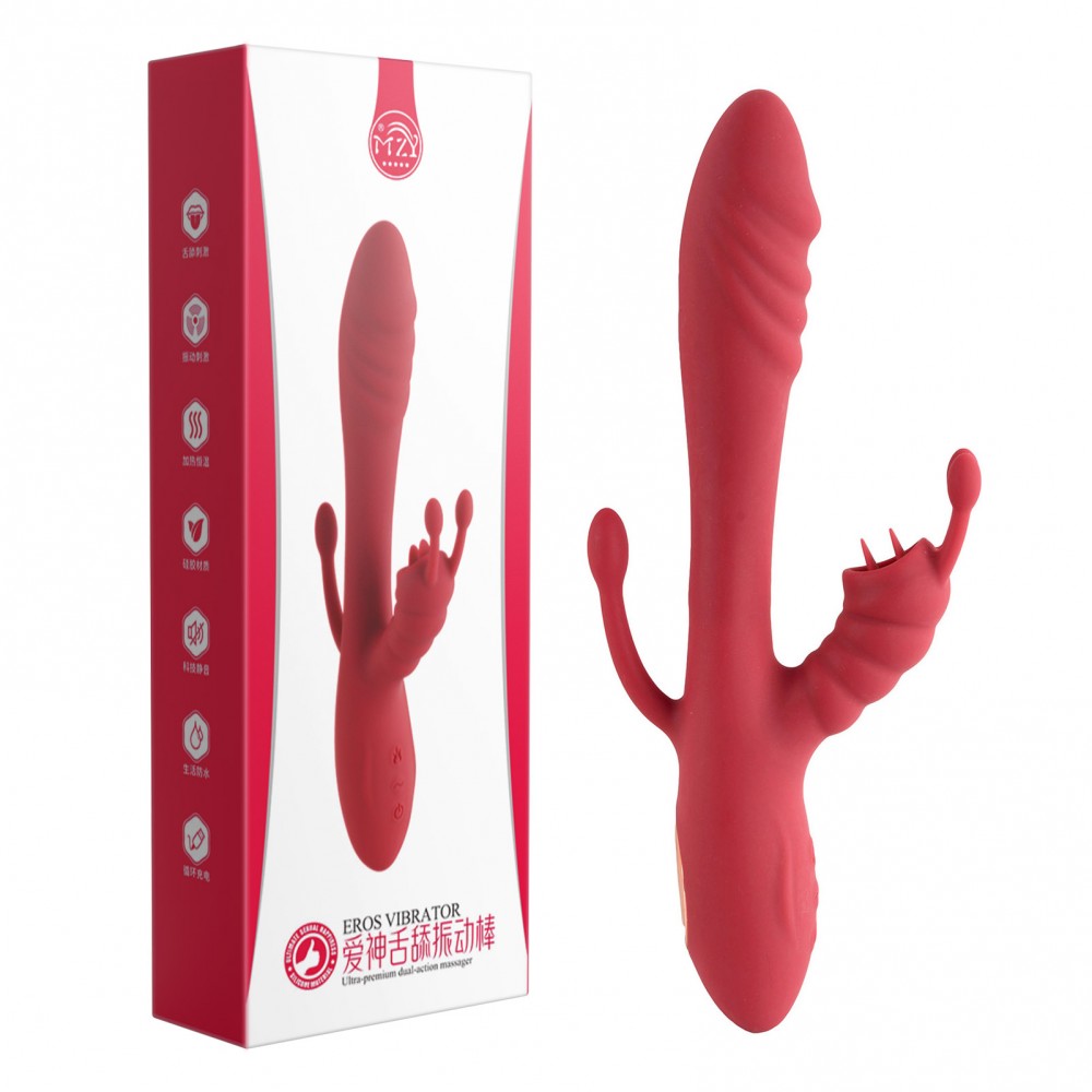Vibrador de ponto G, com estimulador de clítoris. 12 modos de vibração e função de aquecimento. Dupla penetração, proporcionando maior prazer. Estimulador de clítoris no formato de língua, com função de vai e vem.